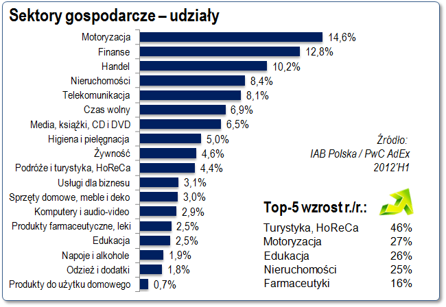 W czołówce rankingu branżowego nastąpiły drobne przetasowania, jednak grono ścisłych liderów pozostaje to samo. Tym razem motoryzacja, finanse i handel wygenerowały prawie 40% wydatków na reklamę online. Artykuły FMCG, zgrupowane na podstawie poniższej klasyfikacji, stanowiły łącznie 12%, podczas gdy dobra trwałe ponad trzykrotnie więcej (37%). Największy wzrost rok do roku wykazała branża turystyczno-gastronomiczna, a następnie: motoryzacja, edukacja i nieruchomości. Warto także zauważyć, że wzrostem wykazały się także: sektor farmaceutyczny, czas wolny, handel, a także napoje.