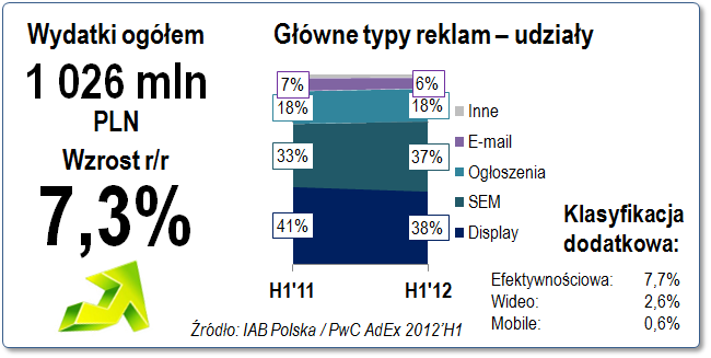Pomimo ogólnych spadków na wydatki reklamowe w mediach, cały rynek online rośnie, osiągając w pierwszym półroczu 2012 już 17,8% całego tortu reklamowego w Polsce (za Starlink). IAB Polska w Raporcie Strategicznym – Internet 2010 prognozowało, że w roku 2012 przekroczona zostanie granica 2 miliardów wydanych na reklamę online. Według AdEx w pierwszym półroczu roku bieżącego przekroczona została już granica pierwszego miliarda i wszystko wskazuje na to, że pomimo trudnej sytuacji na rynku mediowym, rok 2012 przyniesie dla reklamy cyfrowej kolejne rekordy.