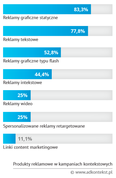 Agencje i domy mediowe dostrzegają różnorodność formatów reklamowych dostępnych w sieciach kontekstowych, co wiąże się z coraz większym udziałem reklamy graficznej w kampaniach realizowanych przez agencje i domy mediowe. Kolejny rok z rzędu najpopularniejszą formą pozostaje graficzna reklama statyczna, wykorzystywana przez 83,3% badanych.