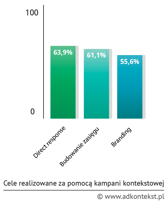 W 2013 roku badani dużą uwagę przykładali do celów efektywnościowych i zasięgowych, realizowanych za pomocą kampanii kontekstowych (odpowiednio 63,9% i 61,1% wskazań). W dalszej kolejności znalazły się cele brandingowe, które wymieniła ponad połowa respondentów.