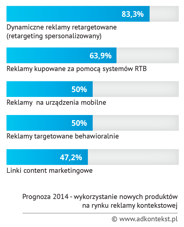 Wśród metod targetowania wymienionych przez ankietowanych, coraz większą popularność zdobywa retargeting – obecnie wykorzystywany już średnio w 38% kampanii prowadzonych w sieciach kontekstowych. 83,3% ankietowanych planuje korzystanie z retargetingu w 2014 roku.