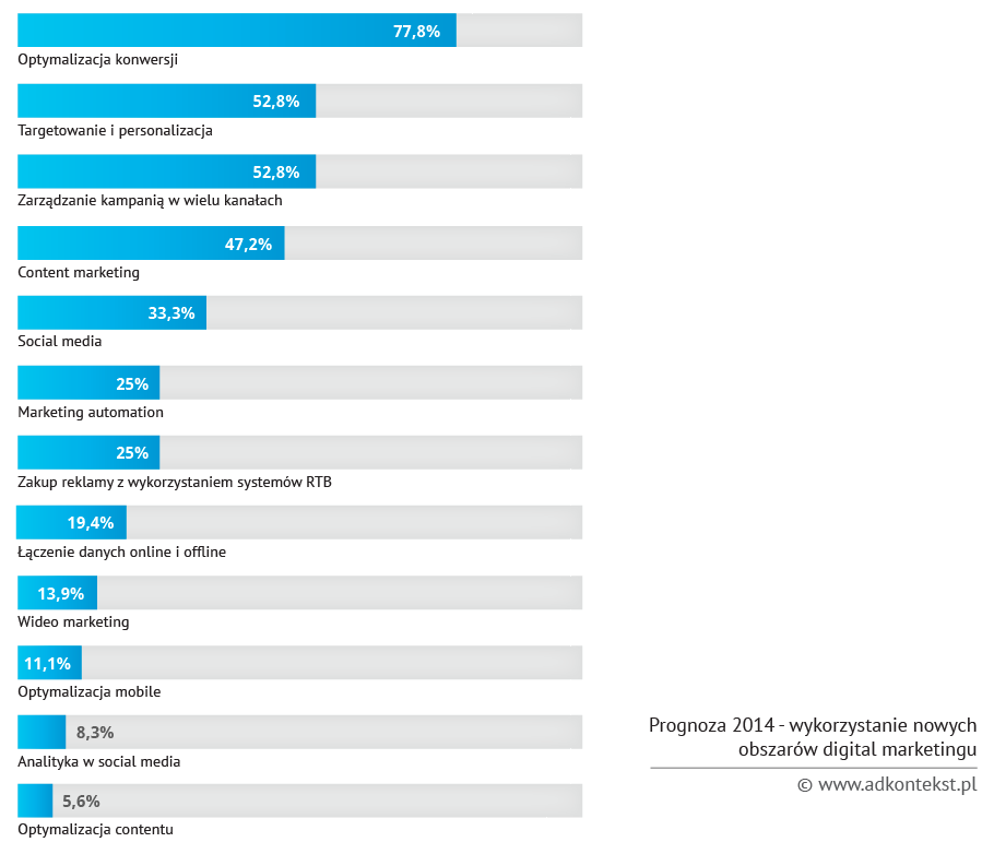 Tegoroczna edycja badania została rozszerzona o tematykę najważniejszych trendów w digital marketingu. Pytani o najwyższe priorytety w działaniach marketingowych w 2014 roku, przedstawiciele agencji i domów mediowych wskazali optymalizację konwersji (77,8%), targetowanie i personalizację oraz zarządzanie kampanią w wielu kanałach (52,8%), a także content marketing (47,2%). Wysokie miejsce zajmuje też zakup reklamy z wykorzystaniem systemów RTB (25%).
