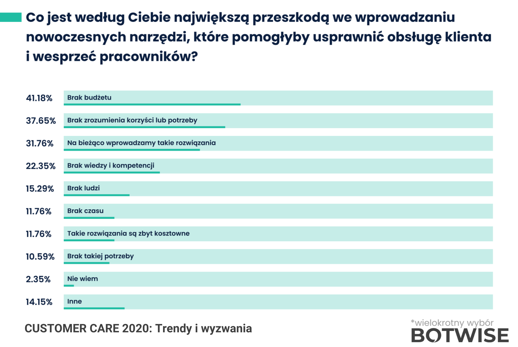 Najczęściej wymienianą przeszkodą był brak budżetu. Warto tu jednak wspomnieć o tym, że często taka inwestycja pozwoli nam długofalowo na spore oszczędności mi.in. w kontekście zatrudnienia (np. kiedy powtarzalne zadania zostaną zautomatyzowana). Może się zatem okazać, że wcale nie o budżet tutaj chodzi; eksperci obsługi klienta przyznają, że problemem jest czynnik ludzki, brak zrozumienia korzyści. Osoby decyzyjne mogą się obawiać, że wdrożenie nowoczesnych narzędzi wiąże się ze skomplikowanym procesem adaptacji czy koniecznością dysponowania umiejętnościami, których nie posiadają (i nie mają czasu pozyskać).