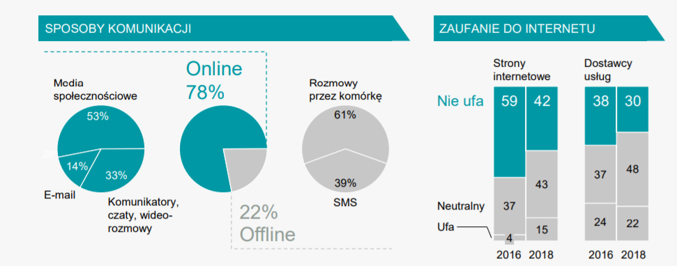 - cyfrowy Polak lub Polka w 2018 r. są podłączeni do sieci, na różnych urządzeniach, łącznie średnio 11 godzin dziennie, czyli o pięć godzin dłużej niż w 2016 r.,