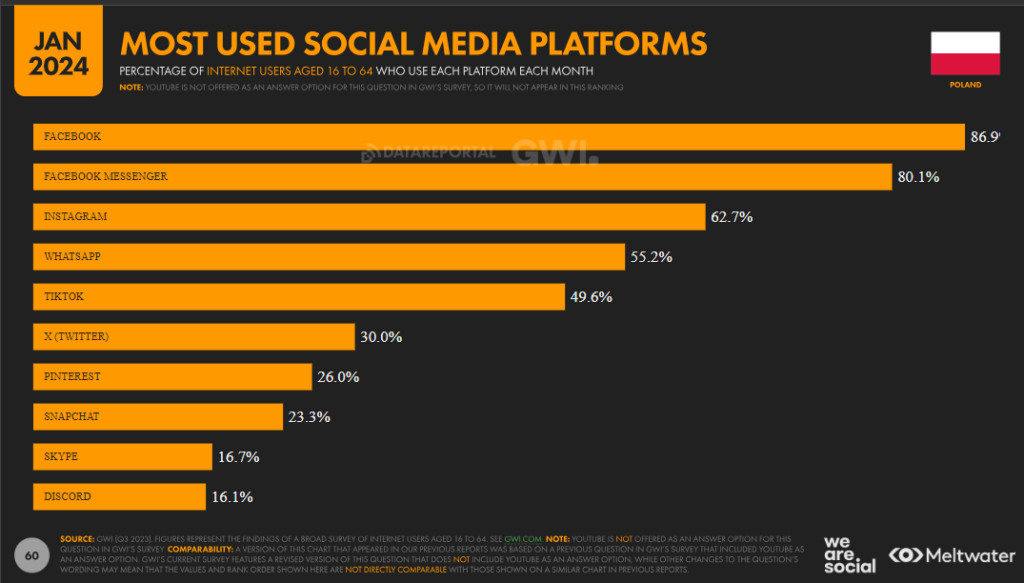 Jakie portale społecznościowe Polacy wybierali najchętniej? Wśród TOP 3 nie zabrakło Facebooka, z którego korzysta 86,9% polskich internautów, Messengera (80,1%), a także Instagrama z wynikiem 62,7%. Po drugiej stronie stawki znalazły się Discord i Skype, obie z wynikiem około 16%.