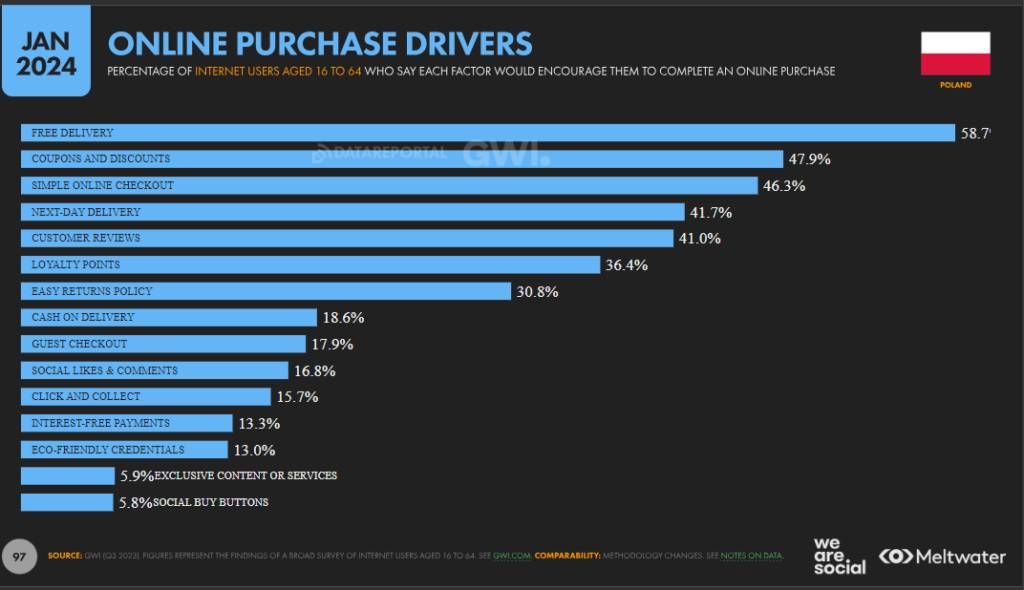 Raport „Digital 2024: Poland” uwzględnia również aspekty związane z obszarem e-commerce w Polsce. I tak, z publikacji wynika, że wśród najczęstszych powodów wizyt w e-sklepach wymieniana jest możliwość darmowej dostawy, a także dostęp do ofert specjalnych i łatwość realizowania transakcji.