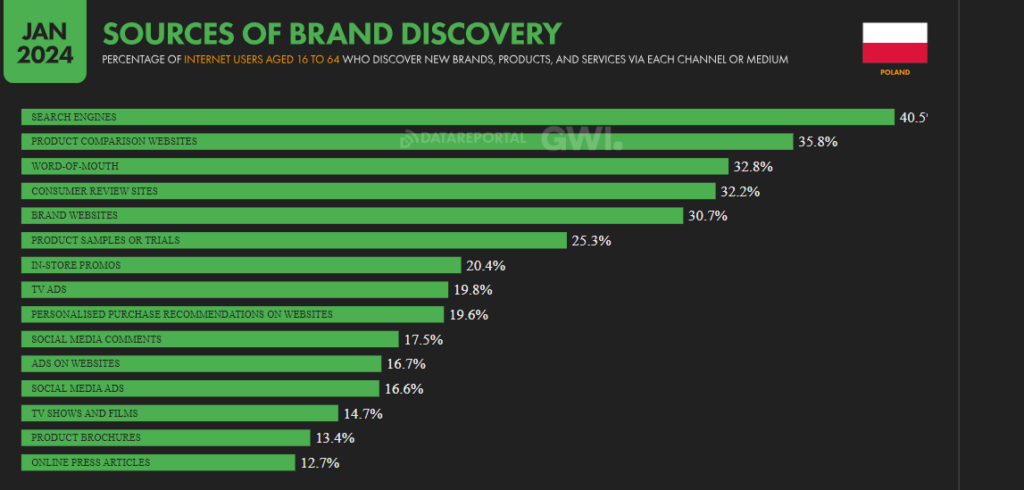 Jak wynika z raportu, wiadomości na temat poszczególnych marek najchętniej czerpiemy z wyszukiwarek internetowych (40,5%) oraz ze stron umożliwiających łatwe porównanie produktów (35,8%).