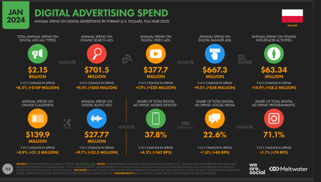 Analizując świat online w Polsce na przełomie 2023 i 2024 roku warto przyjrzeć się także wydatkom z nim związanym. Raport „Digital 2024: Poland” uzmysławia, że według danych na styczeń tego roku sięgnęły one 2,15 miliarda dolarów, co stanowi wzrost o 8,5%. Wzrosły też roczne wydatki na reklamę digital audio (+9,7%).