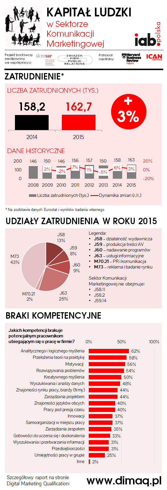 W obliczu dynamicznej cyfryzacji, IAB Polska – we współpracy z SKM/SAR oraz ZFPR – zrealizował projekt badawczy, którego celem było skupienie się na kapitale ludzkim z perspektywy informacji, które mogą być przydatne organizacjom w zarządzaniu zasobami ludzkimi oraz w przygotowaniu pracowników do pracy. Raport z badania skupia się na szeregu branż ściśle związanych z komunikacją marketingową: wydawniczą, telewizyjną, reklamową, PR czy badawczą, które określone są mianem Sektora Komunikacji Marketingowej (SKM). Celem projektu było przedstawienie takich zagadnień jak wielkość i dynamika zmian w zatrudnieniu, profil demograficzny pracowników czy ocena jakości kształcenia akademickiego i wykształcenia pracowników wraz ze wskazaniem braków w wykształceniu i kompetencjach.