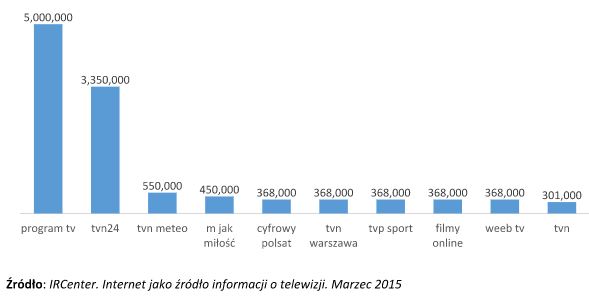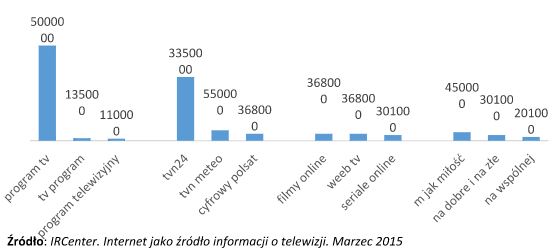 *Dane pochodzą z raportu Internet jako źródło informacji o telewizji zrealizowanego przez IRCenter w marcu 2015. Raport opiera się na badaniu słów kluczowych wpisywanych do wyszukiwarki Google i skanie internetu; analiza dotyczyła słów kluczowych związanych z telewizją za okres ostatnich 12 miesięcy i uwzględniała: liczbę wyszukiwań i liczbę publikacji – ogółem i w granulacji miesięcznej. Więcej informacji o raporcie oraz jego pełna wersja do pobrania znajduje się na stronie.
