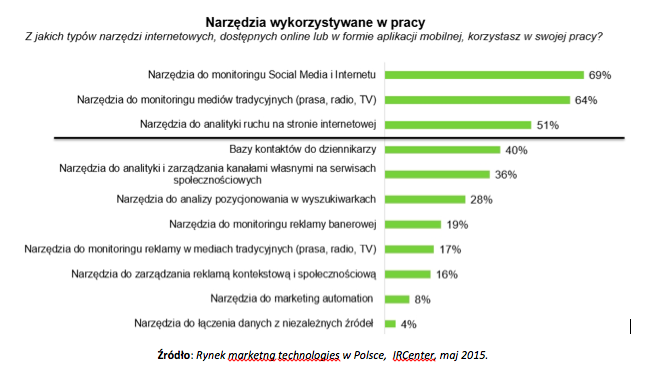Wśród najczęściej wykorzystywanych technologii znalazły się narzędzia do monitorowania mediów społecznościowych (69%) i tradycyjnych (64%). Większość użytkowników chwali sobie rozwiązania, z których korzysta i nie planuje zmiany dostawcy w najbliższy czasie. Średnio co drugi użytkownik korzysta także z narzędzi do analityki stron internetowych. Natomiast 36% respondentów wykorzystuje w pracy również narzędzia do zarządzania społecznościami fanowskimi w mediach społecznościowych. Ten typ narzędzi, a także rozwiązania służące do monitoringu reklamy w mediach tradycyjnych w mniejszym stopniu spełniają oczekiwania użytkowników, którzy częściej deklarują chęć zmiany dostawcy usług. Kryterium ich wyboru nie będzie cena, tylko wygoda użycia i rzetelność prezentowanych wyników.