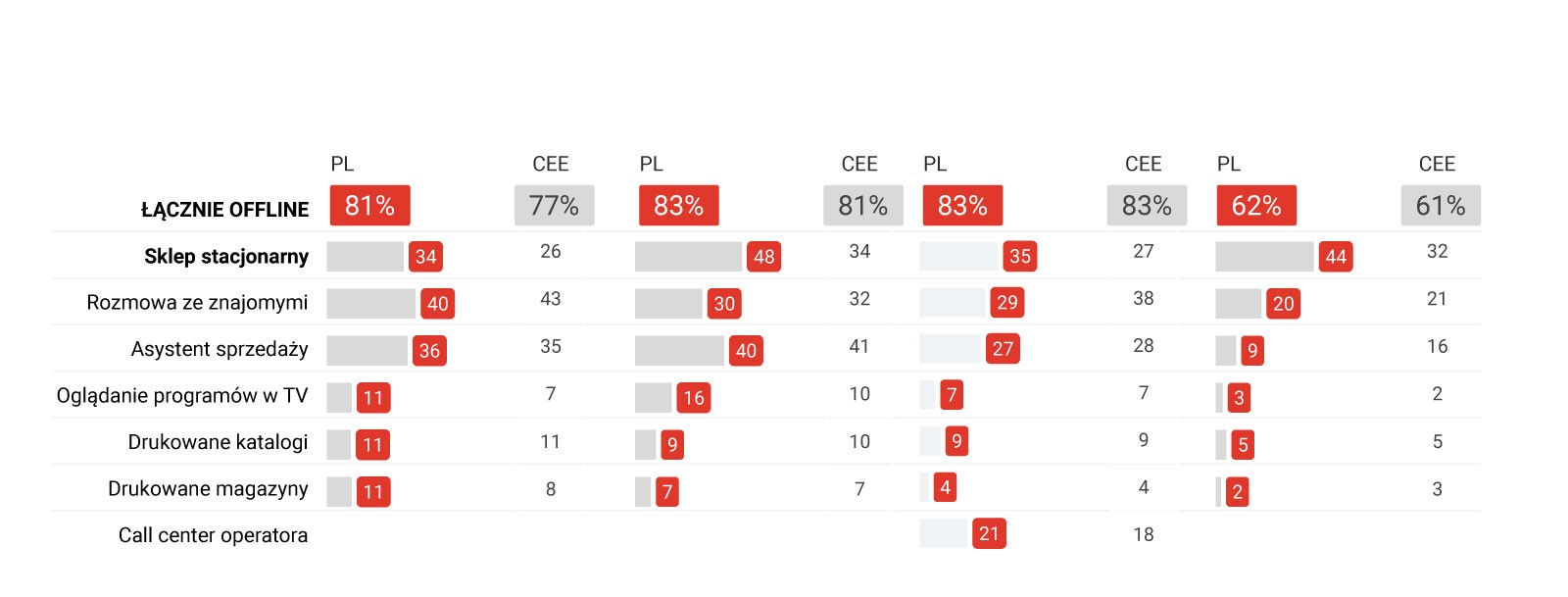 - 81% nabywców użyło punktów styczności poza siecią (choć kategoria ta przeważa w stronę sieci), a niemal 2/5 użyły urządzeń mobilnych do poszukiwania informacji podczas wizyt w tradycyjnych sklepach.