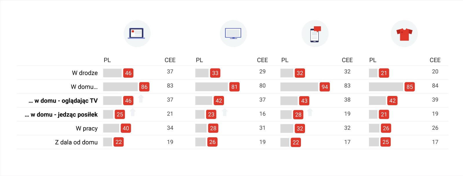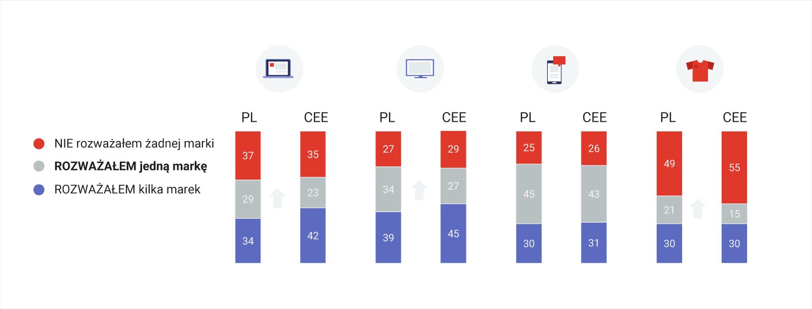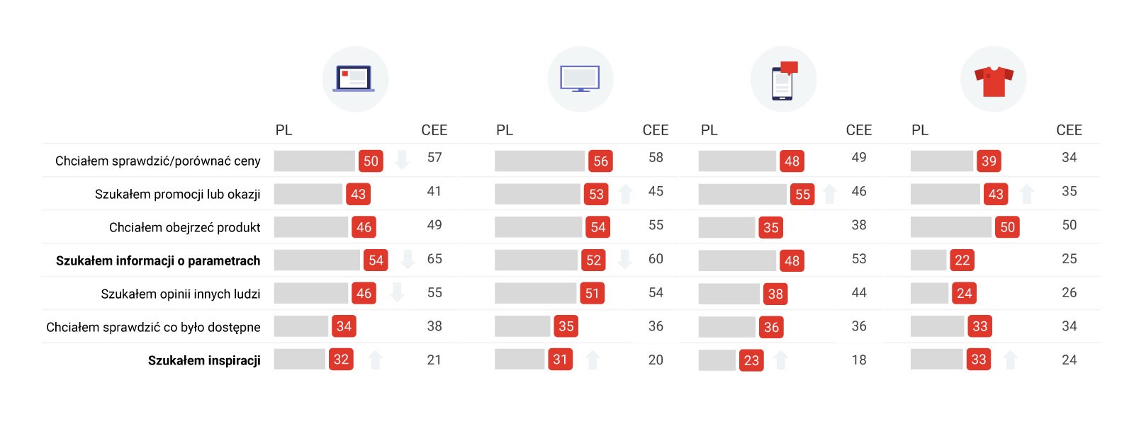 Źródło: Raport Path-to-purchase Country Insights, sierpień 2018, Google CEE i IPSOS: dane w %, podstawa – n=300 dla kraju. Strzałki – znaczne różnice w por. z kategorią CEE ŁĄCZNIE na poziomie 95%.
