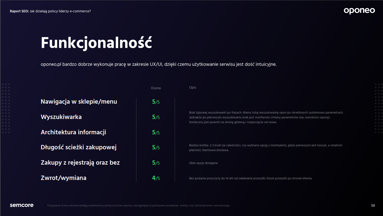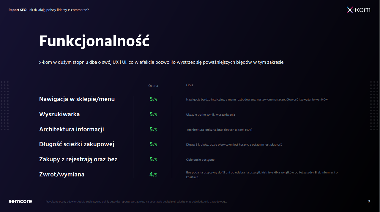 Jednym z najważniejszych aspektów sklepu internetowego jest jego funkcjonalność. Wśród przeanalizowanych sklepów największa funkcjonalnością charakteryzują się x-kom i oponeo.