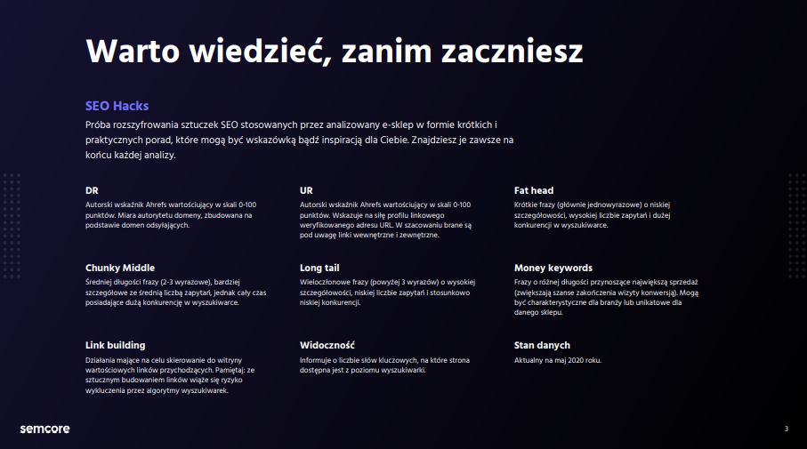 Na potrzeby raportu Semcore przeprowadził audyt i analizę kilku znanych sklepów e-commerce, które osiągnęły sukces w Polsce. W badaniu wyodrębnione i przeanalizowane takie sklepy jak x-kom, empik.com, DOZ.pl, eobuwie, oponeo, Zalando. Pod uwagę wzięto wiele wskaźników, w tym m.in. słowa kluczowe, link building, pozycje w wyszukiwarkach, kwestie techniczne, funkcjonalność strony, czy też content marketing. Semcore w ramach raportu wskazuje również zidentyfikowane w sklepach błędy, a także warte uwagi praktyki przez nie stosowane.