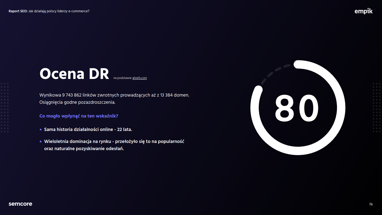 Jak wynika z raportu, wśród analizowanych e-sklepów większość wykazuje wysoki wskaźnik DR, a najwyższy sklep empik.com.