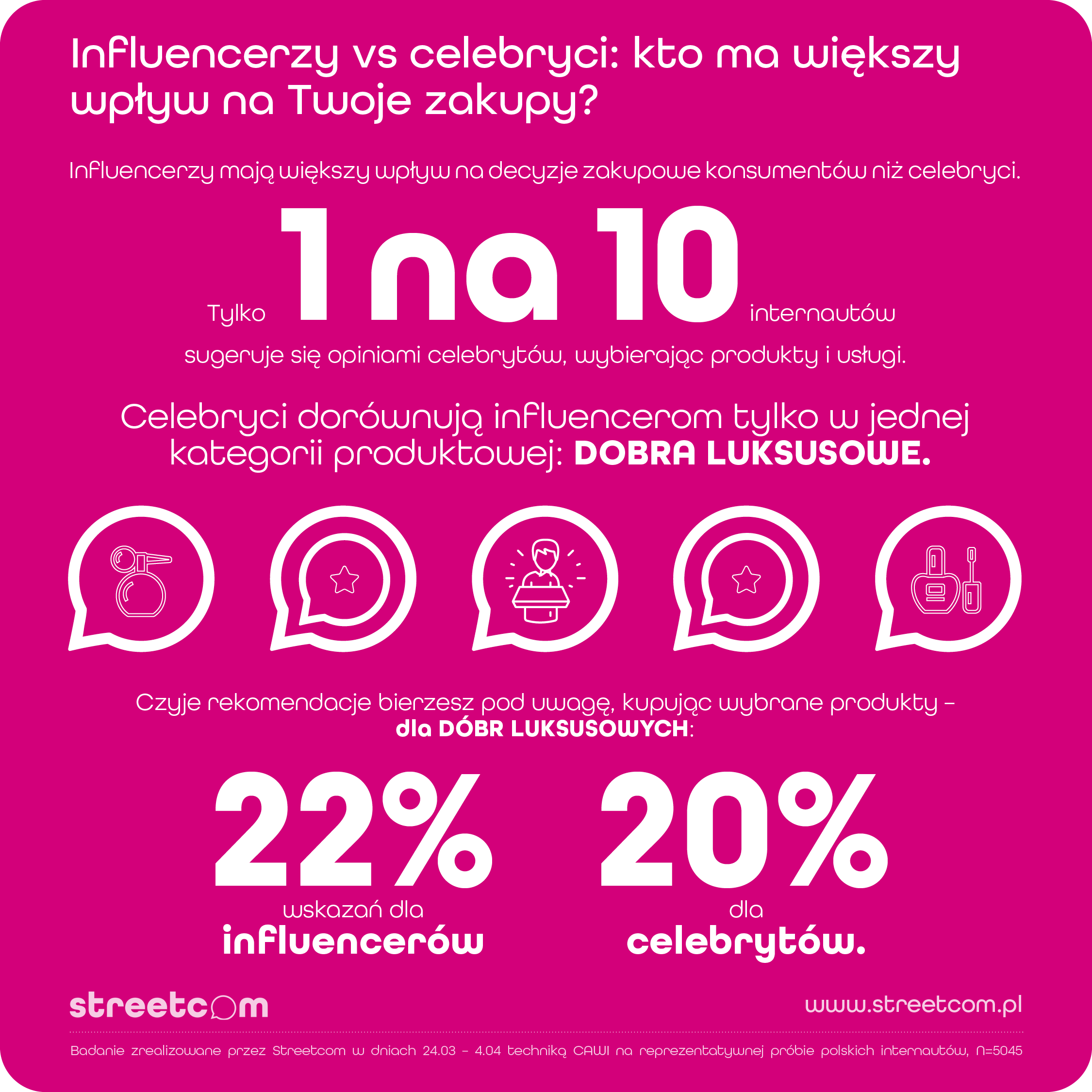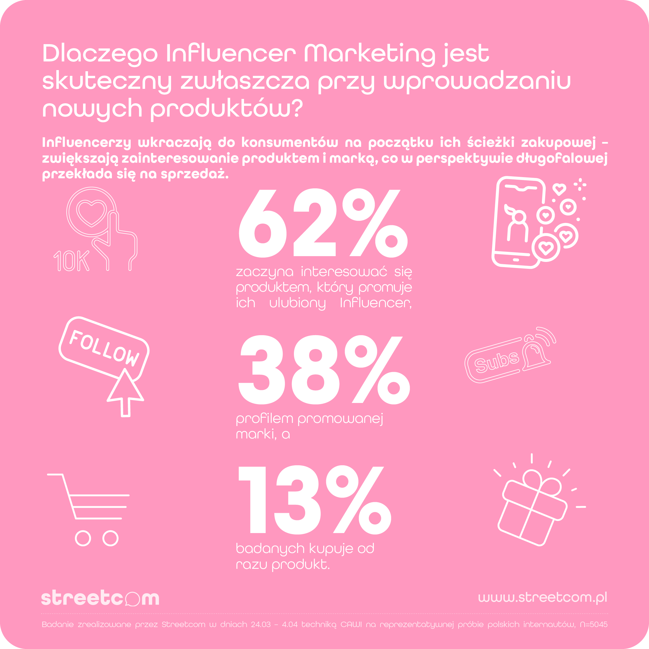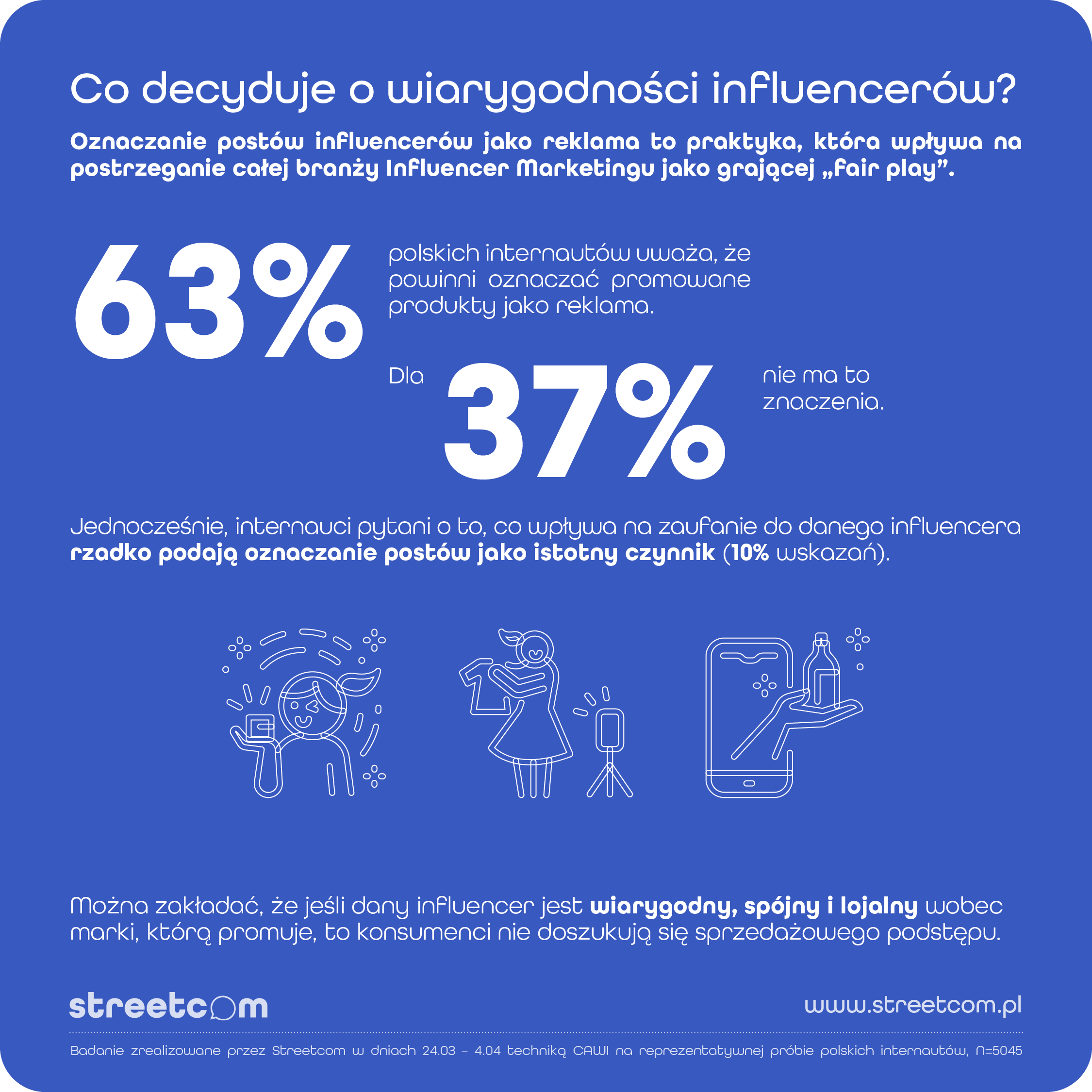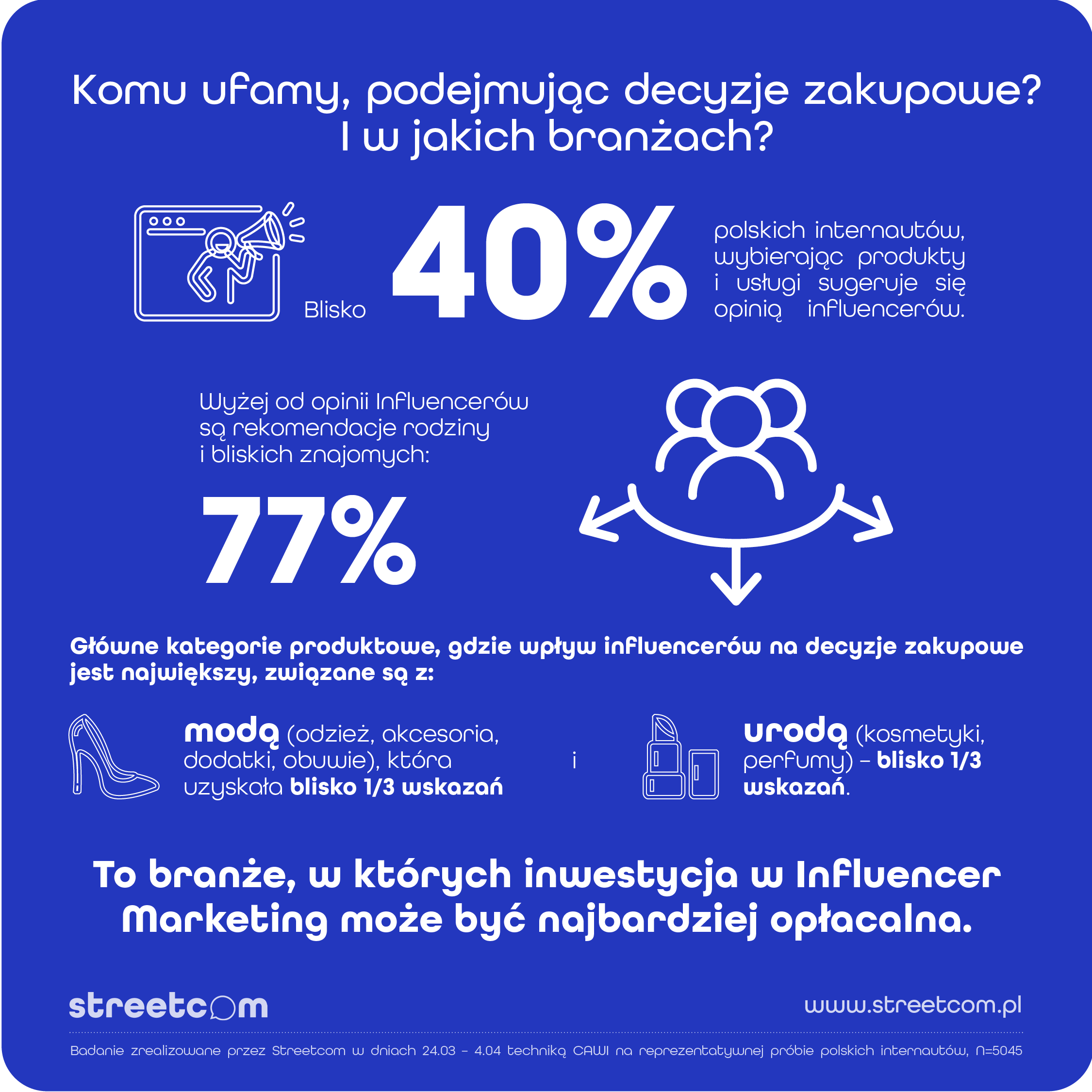 Blisko 40% polskich internautów sugeruje się opinią Influencerów, wybierając produkty i usługi. Celebryci pod względem wpływu na konsumentów dorównują influencom tylko w jednej kategorii produktowej – dobra luksusowe. Moda i Uroda to kategorie produktowe, gdzie wpływ Influencerów jest największy – 55% wskazań. 63% polskich internautów uważa, że Influencerzy powinni oznaczać promowane produkty jako reklama. Takie dane znajdziemy w raporcie Agencji Hash.Fm by Streetcom pt.: „Alchemia zaufania, czyli jaki rodzaj Influencer marketingu sprzedaje”.