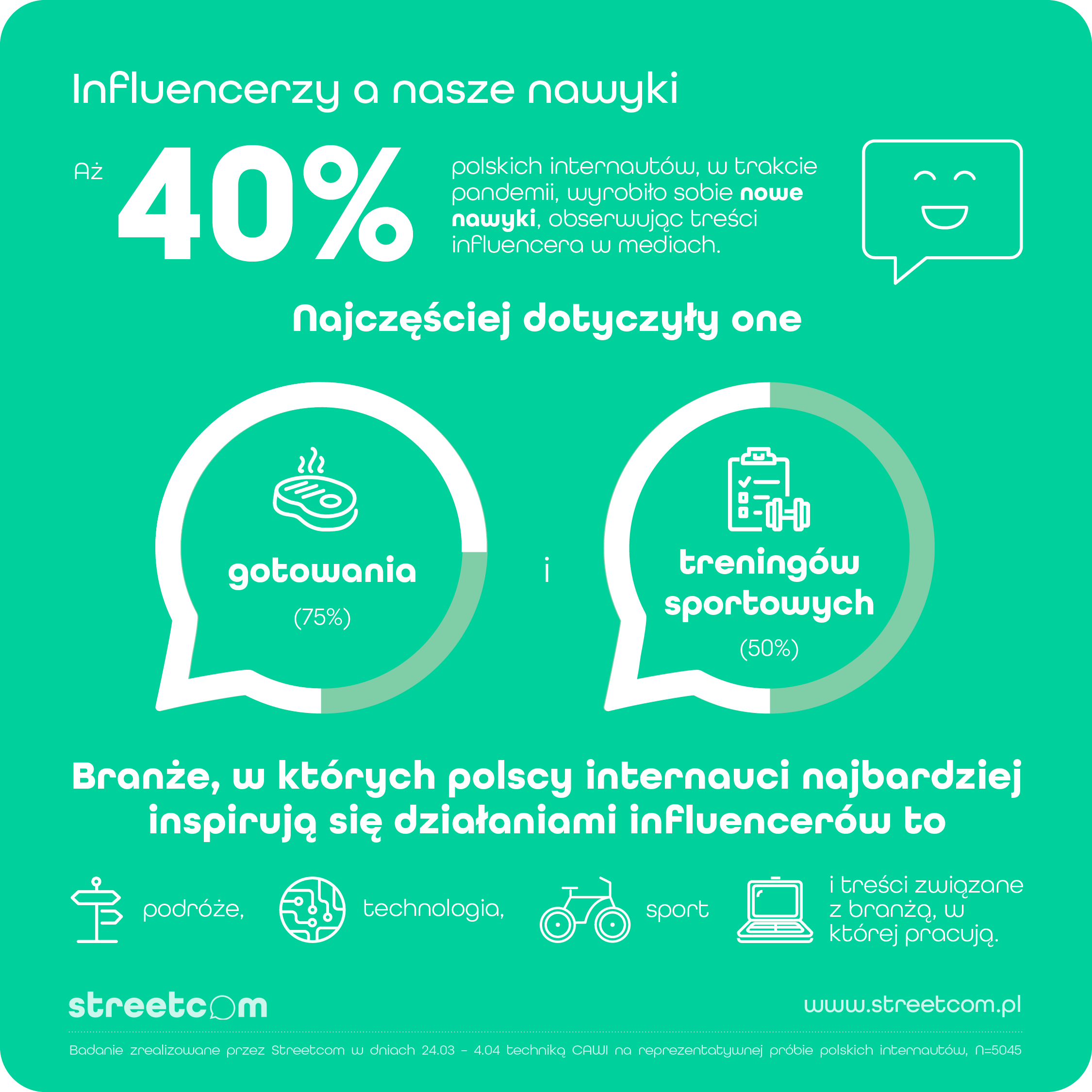 Z kolei aż 40% polskich internautów, w trakcie pandemii, wyrobiło sobie nowe nawyki, obserwując treści influencera w mediach. Najczęściej dotyczyły one gotowania (3/4 wskazań) i treningów sportowych (ponad 50% wskazań). Branże, w których polscy internauci najbardziej inspirują się działaniami influencerów to podróże, technologia, sport i treści związane z branżą, w której pracują.