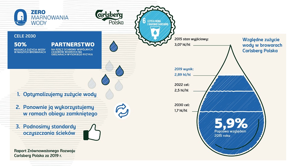 Ambicją Grupy Carlsberg jest ograniczenie zużycia wody z 3,4 hl wody na 1 hl gotowego piwa (dane bazowe z 2015 r.) do 1,7 hl /hl do roku 2030. Carlsberg Polska aktywnie uczestniczy w realizacji tego celu. Monitorowanie i redukowanie zużycia wody, inwestycje w browarach i wdrażane innowacje, pozwalają efektywnie nią gospodarować i tam, gdzie to możliwe, wykorzystywać ponownie, np. na linii pakowania do zraszania puszek po nalewie, aby oczyścić je z piany. W 2019 r. w Carlsberg Polska wykorzystywano ok. 2,9 hl wody na 1 hl gotowego piwa.