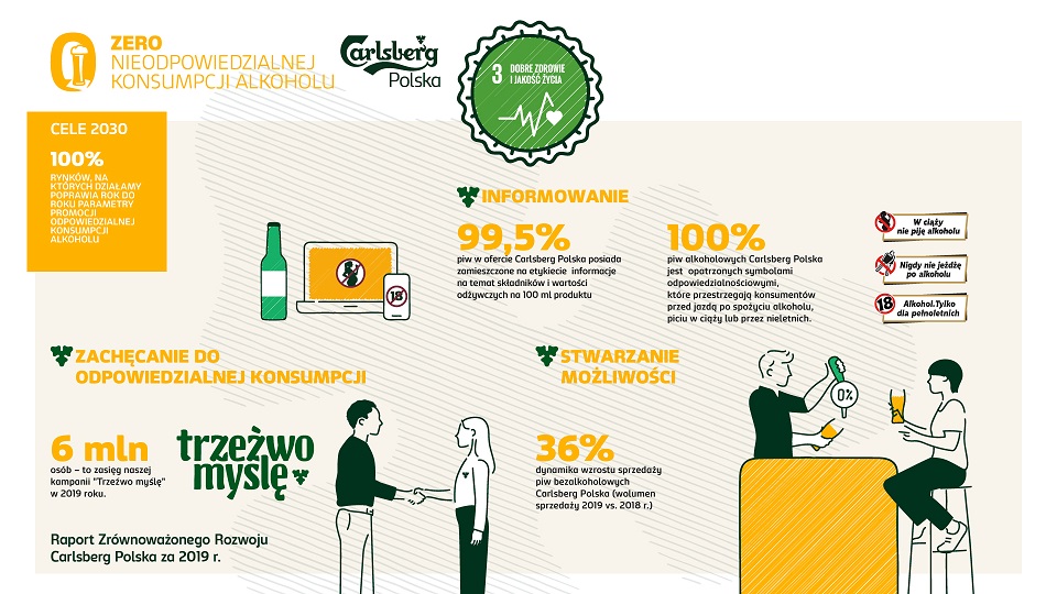 Carlsberg Polska wspiera konsumentów i społeczeństwo w odpowiedzialnej konsumpcji alkoholu na trzy sposoby – zapewniając z roku na rok szersze portfolio wariantów bezalkoholowych – w 2019 r. było ich w ofercie 7 (w tym 4 nowości), edukując oraz zachęcając do dokonywania odpowiedzialnych wyborów. Jednym z kluczowych działań w tym obszarze jest kampania społeczna pod hasłem „Trzeźwo myślę”. W 2019 r. z przekazem edukacyjnym kampanii zapoznało się ok. 6 mln odbiorców.