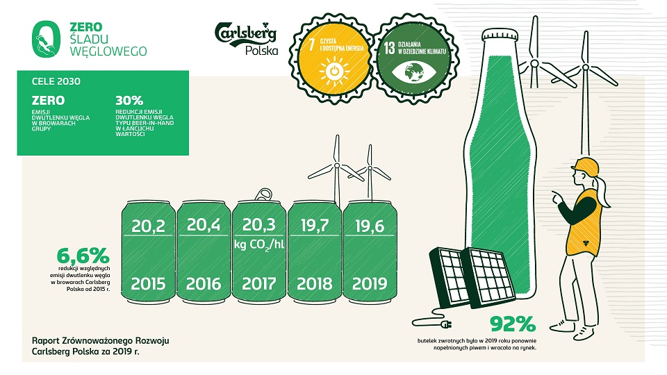 Grupa Carlsberg dąży do osiągnięcia neutralności klimatycznej w swoich browarach do roku 2030 i ograniczenia o 30% emisji CO2 w łańcuchu wartości (tzw. emisji „beer- in-hand”) względem bazowego roku 2015. To zobowiązanie wpisuje się w cele Porozumienia Paryskiego z 2015 r. – ograniczenia globalnego wzrostu temperatury o 1,5°C.