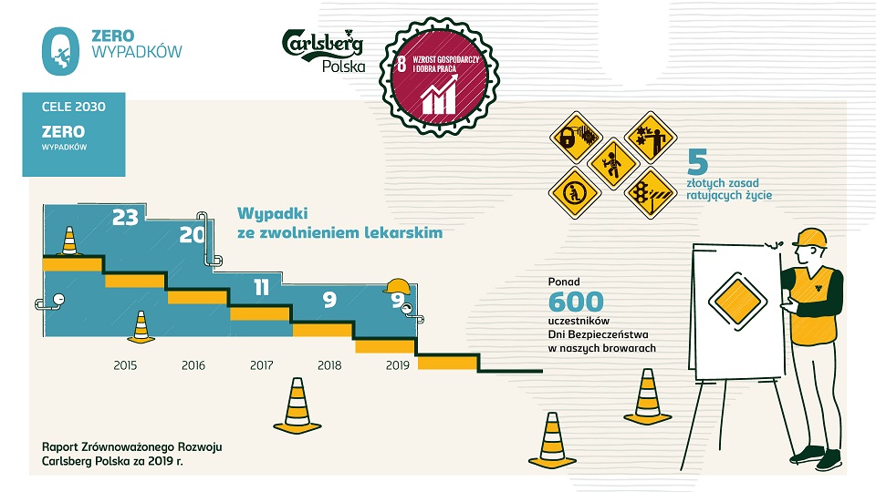Bezpieczeństwo jest zakorzenione w kulturze pracy w Carlsberg Polska. Wszystkie browary firmy posiadają m.in. certyfikowany System Zarządzania Bezpieczeństwem i Higieną Pracy OHSAS 18001. W 2019 r. firma odnotowała istotny postęp na drodze do osiągnięcia celu ZERO wypadków. Liczba wypadków bez zwolnienia lekarskiego zmniejszyła się o blisko 70%. Natomiast liczba wypadków ze zwolnieniem lekarskim spadła z 13 w 2015 r. do 3 w 2019 r. Ponadto firma zwiększyła zaangażowanie pracowników w dbanie o bezpieczeństwo w miejscu pracy. Liczba obserwacji sytuacji i zachowań potencjalnie niebezpiecznych wzrosła o 261% (blisko 11 000 obserwacji), co pozwoliło wyeliminować wiele potencjalnych zagrożeń.