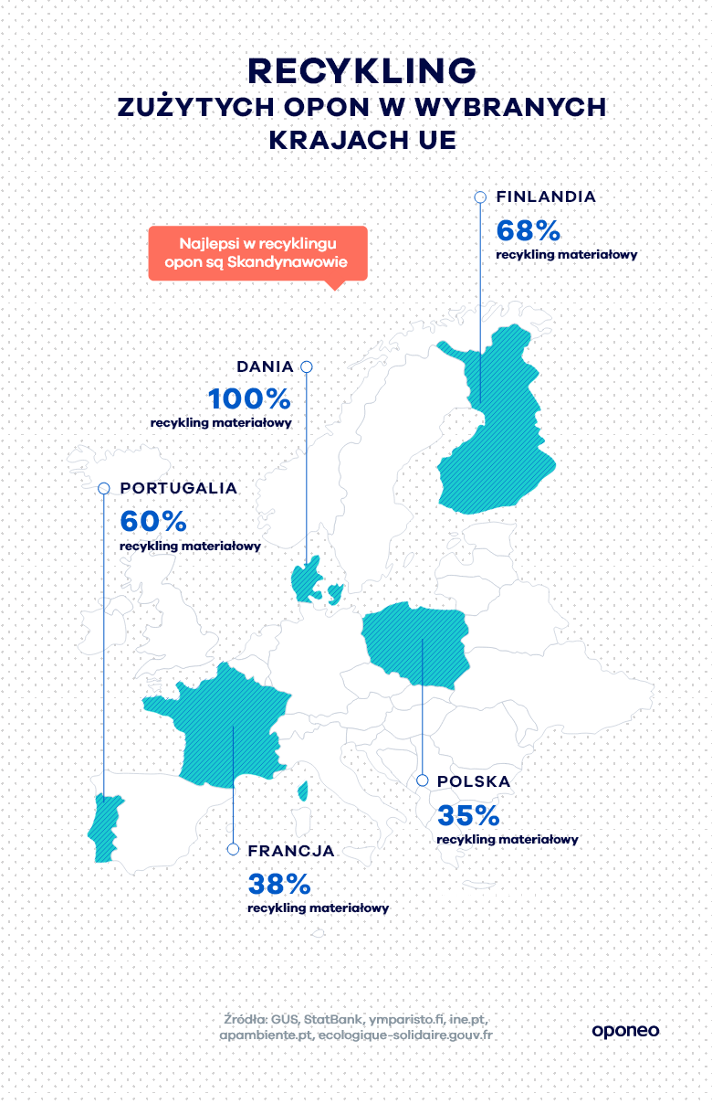 W naszym kraju procent odzysku materiałowego jest wciąż niski, chociaż jak wskazują statystyki z roku na rok jest coraz lepiej. Dla porównania w Danii recyklingowi materiałowemu poddaje się 100% odzyskanych opon. Oczywiście opon wprowadzonych rocznie do obiegu na rynku duńskim jest znacznie mniej niż w Polsce, jednakże działający tam system będzie sprawnie działać również przy wciąż rosnącej liczbie. Głównym problemem w naszych warunkach jest zbyt mała ilość firm, które wykorzystują materiał pochodzący z recyklingu do wytwarzania nowych produktów. Mimo tego rozwój technologii i inicjatyw takich jak polski startup Syntoil (technologia czyszczenia zanieczyszczonej sadzy do postaci sadzy technicznej) świadczą o tym, że również na naszym rynku takie przedsięwzięcia mają sens ekonomiczny.