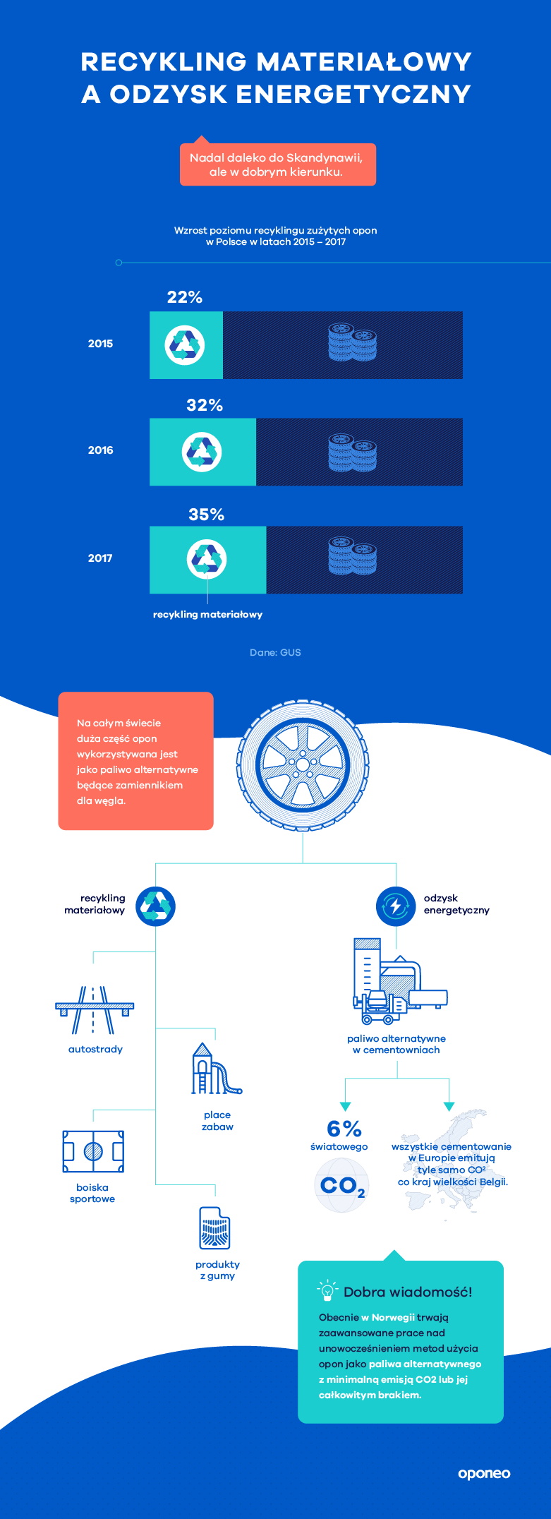 Większość opon poddanych recyklingowi w Polsce poddawanych jest odzyskowi energetycznemu. Opony poddawane są spalaniu przy użyciu specjalnych pieców w kontrolowanych warunkach, co pozwala na relatywnie niskoemisyjną produkcję energii, która wykorzystywana jest w niektórych energochłonnych branżach przemysłu. Trzeba jednak przyznać, że nie jest to rozwiązanie idealne. Znacznie bardziej dochodowym działaniem i jeszcze bardziej korzystnym z punktu widzenia ekologii jest wcześniej wspomniany recykling materiałów.