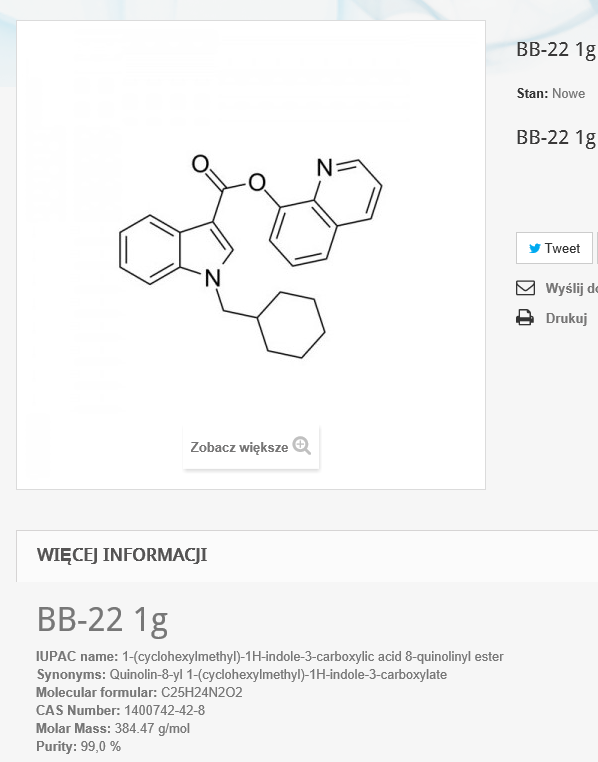Już na pierwszy rzut oka wysuwa się duża liczba produktów reklamowanych po prostu wzorem chemicznym: alfa-PVP, AM-2201, mefedron, 4-mmc. Obok nazwy pojawia się graficzny zapis struktury chemicznej takiego środka, jakby żywcem wyjęty z zeszytu studenta chemii. Po kliknięciu weń, pojawia się więcej informacji dotyczących chemicznych właściwości (np. BB-22 to: 1-(cyclohexylmethyl)-1H-indole-3-carboxylic acid 8-quinolinyl ester),