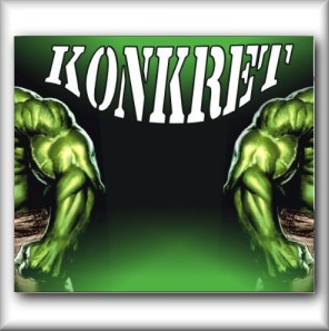 I znów, błąd za błędem: grafika powtarza nazwę produktu zamiast ją rozszerzać, zdjęcie jest źle dobrane (młody konsument vs. podstarzały Afgańczyk), nieestetyczna czcionka. Kolejną autorską ofertą jest produkt zwany „Konkretem”, wizualizowany konkretnymi mięśniami znanego bohatera popkultury, Hulka.
