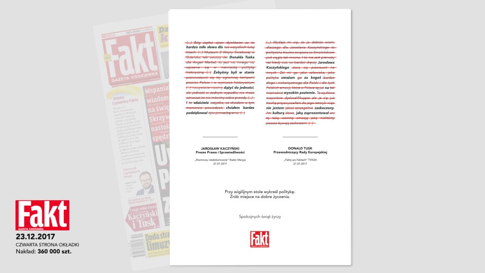 Na ostatniej stronie „Faktu” opublikowano dwie kolumny z cytatami dwóch bezsprzecznych ikon konfliktu polsko-polskiego, z których wykreślone zostały słowa związane z polityką.