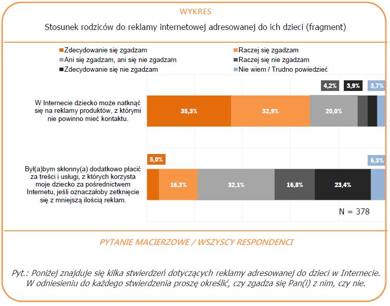 Aż 35,3% rodziców uczestniczących w badaniu zdecydowanie zgodziło się ze stwierdzeniem, że dzieci w internecie mogą natknąć się na reklamy produktów, z którymi nie powinny mieć kontaktu, natomiast 32,9% z nich raczej zgodziło się z tym stwierdzeniem. Wydaje się więc, że opinia, według której najmłodsi internauci narażeni są na nieodpowiedni dla nich przekaz reklamowy jest dość powszechna wśród najbardziej zainteresowanych – ich rodziców. Z drugiej strony, rodzice uważają za najatrakcyjniejsze finansowanie treści i usług internetowych, z których korzystają ich dzieci z funduszy pochodzących z reklamy. Jedynie co dwudziesty z badanych rodziców odpowiedział, że zdecydowanie byłby w stanie ponosić dodatkowe opłaty za usługi i treści, z których korzysta ich dziecko w zamian za zmniejszenie jego ekspozycji na obecne w sieci przekazy reklamowe, a 16,1% z nich raczej zgodziłoby się na takie rozwiązanie.