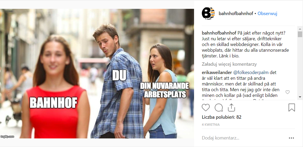 Szwedzki dostawca usług internetowych Bahnhof w swoim ogłoszeniu rekrutacyjnym postanowił wykorzystać popularny mem „Distracted Boyfriend”. W przygotowanej przez firmę wersji grafiki dziewczyna chłopaka jest opisana jako „twoja obecna praca”, a atrakcyjna dziewczyna, za którą ogląda się chłopak to firma Bahnhof.