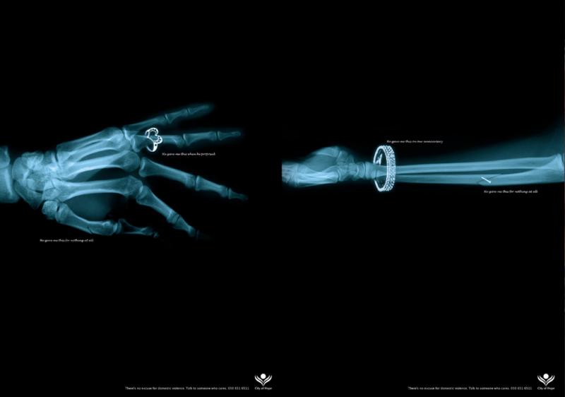 Kobiety z Zjednoczonych Emiratów Arabskich mają ograniczone prawa. Pochodząca z 2008 roku kampania przeciwko przemocy domowej, pokazuje zdjęcia rentgenowskie, na których widzimy kości, biżuterie, złamanie oraz napis: „To dał mi na urodziny”.