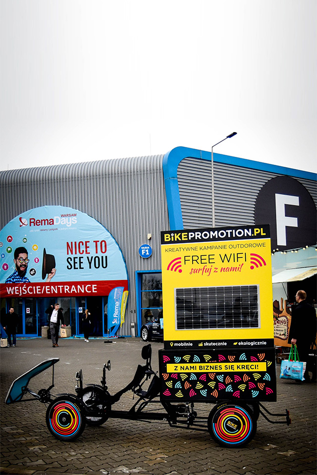 W lutym b.r. podczas Targów Reklamy i Poligrafii RemaDays Warsaw miała miejsce premiera nowoczesnego i funkcjonalnego nośnika reklamowego bikeSAMPLE, który jest już dostępny w ofercie. Nowy model umożliwia m.in. ekspozycję towarów, dystrybucję próbek, doładowanie sprzętów elektronicznych, a także zapewnia dostęp do internetu za pomocą Wi-Fi. Dodatkowo nośnik jest zasilany energią ze źródeł odnawialnych, co zapewnia całkowitą ekologiczność jego użytkowania. Widowiskowy bikeSAMPLE może pełnić rolę zarówno mobilnego nośnika reklamowego, jak i być statyczną atrakcją użytkową, np. dystrybuującą próbki i materiały promocyjne czy dostarczającą Wi-Fi i energię. Idealnie nadaje się do realizacji skutecznych kampanii samplingowych.