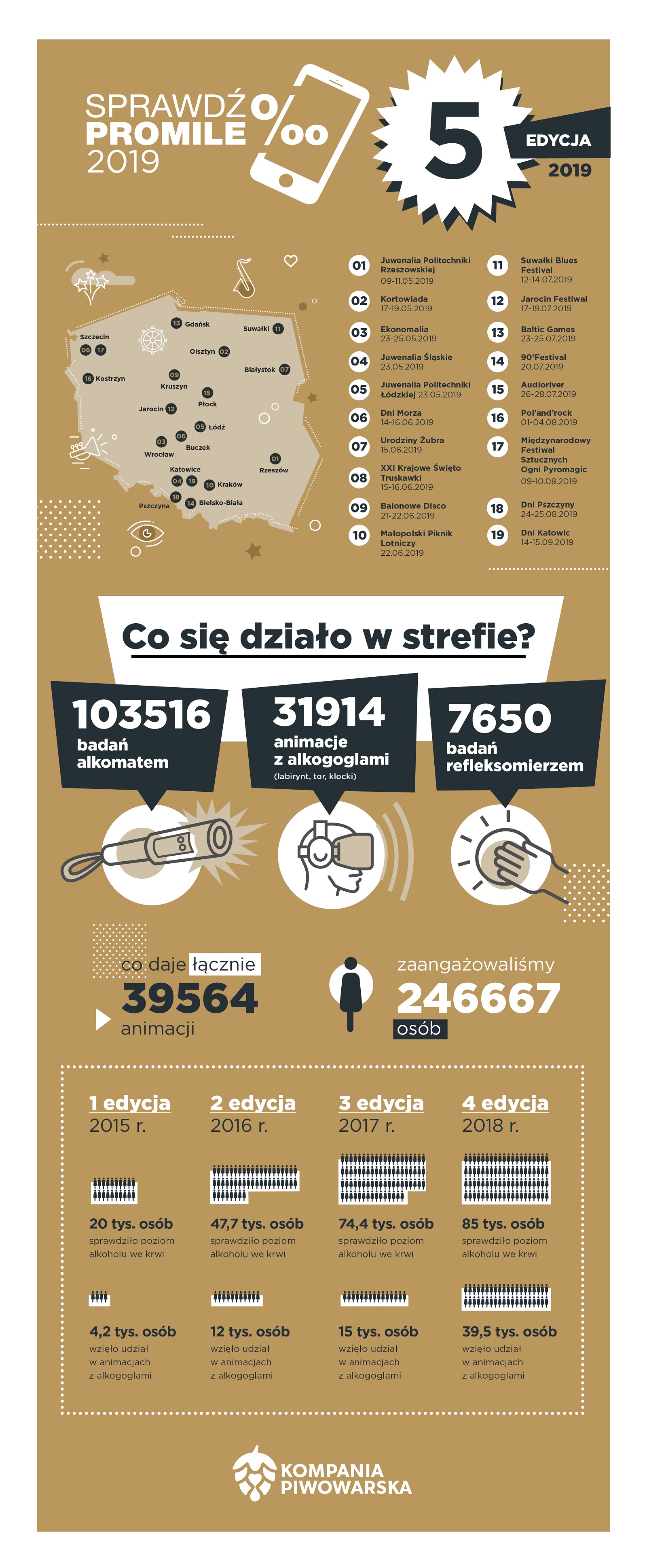 W tym roku przypada również okrągły jubileusz rozpoczęcia swojej misji przez Sprawdź Promile. W ciągu 5 lat Kompania Piwowarska ze strefą odpowiedzialnościową uczestniczyła łącznie w 61 imprezach masowych o rozmaitym profilu i grupach odbiorców. Były to zarówno wydarzenia muzyczne, wielotysięczne biesiady piwne, pikniki lotnicze, imprezy disco polo, masowe wydarzenia studenckie i wiele innych.