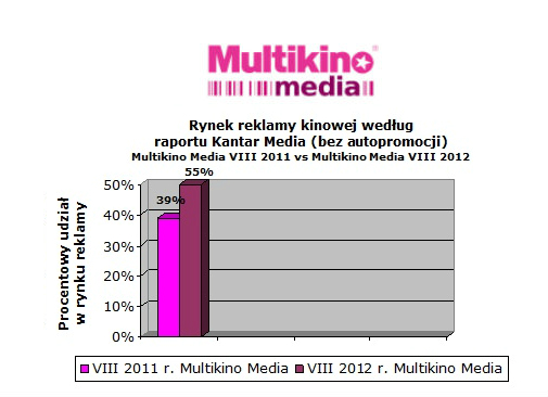 Porównując dane z raportu Kantar Media z 2011 i 2012 roku widać, że spółka Multikino Media w sierpniu bieżącego roku zwiększyła swoje udziały w rynku reklamy kinowej aż o 16 punktów procentowych w stosunku do tego samego miesiąca w roku ubiegłym i osiągnęła rekordowe udziały na poziomie 55%. Do tak dobrego wyniku przyczyniły się między innymi kampanie klientów z branży: telefonii komórkowej, gier komputerowych, fotograficznej, bankowej oraz logistycznej.