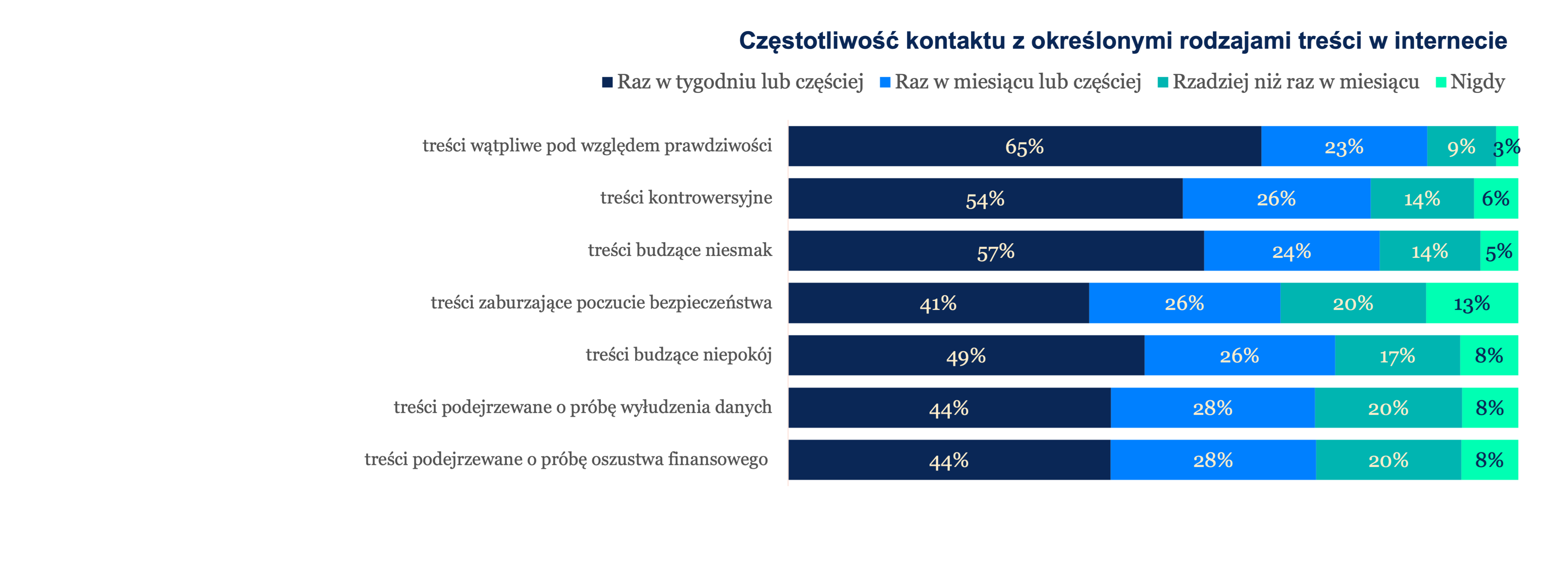 Poza rosnącą świadomością zagrożeń w sieci, zdecydowana większość internautów w Polsce ma regularną styczność (co najmniej raz na miesiąc) z treściami internetowymi budzącymi negatywne emocje lub wątpliwości.