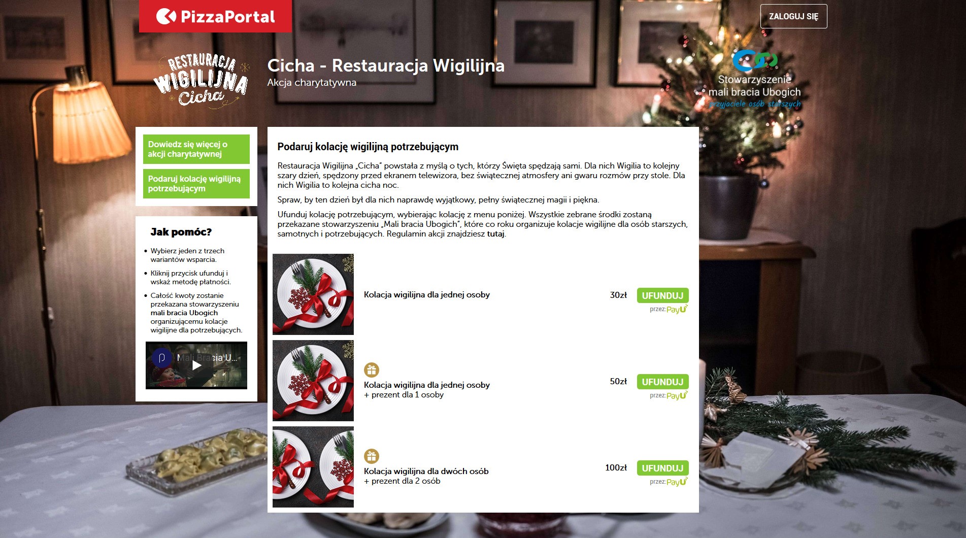 Pomaganie z PizzaPortal.pl jest niezwykle proste, a posiłek podarować może każdy, wpłacając datek na kolację dla jednej, dwóch lub trzech osób. Wystarczy odnaleźć w serwisie Restaurację Wigilijną „Cicha” (PizzaPortal.pl/wigilia) i zamówić posiłek, a wsparcie zostanie przekazane na konto Stowarzyszenia za pośrednictwem PayU.