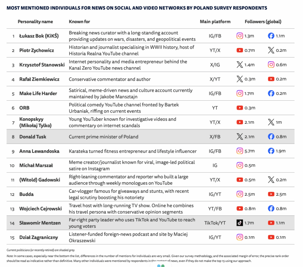 Dane pochodzą z badań Reuters Institute. W badaniach z 2024 i 2025 roku poproszono respondentów, którzy zadeklarowali korzystanie z mediów społecznościowych, by odpowiedzieli, na co zwracają największą uwagę w kontekście wiadomości (marki i dziennikarze, twórcy wiadomości itp.). Następnie, respondenci mieli wskazać marki informacyjne i twórców, na których zwracają największą uwagę.