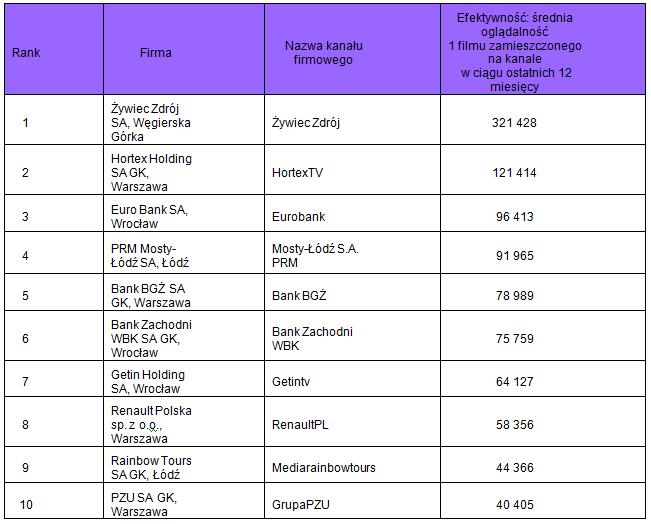 Z badania wynika, iż jedynie 15 proc. firm generuje wysoką efektywność (jeden materiał filmowy oglądany jest ponad 10 tys. razy), a aż 69 proc. przedsiębiorstw osiągnęło oglądalność jednego filmu poniżej 1000 razy. Z 20 największych polskich firm, które zamieściły na swoich stronach najwięcej filmów, tylko 3 znalazły się w pierwszej 20. rankingu.