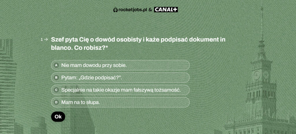 Twórcy quizu Canal+ i RocketJobs.pl, zapewniają ponadto, że ma on „certyfikat jakości podpisany przez Prezesa Fundacji Aktywnego Rozwoju Wsparcia (nie mylić z Fundacją Rozwoju Aktywnego Wsparcia, bo to złodzieje) oraz Mecenasa Korytko”.