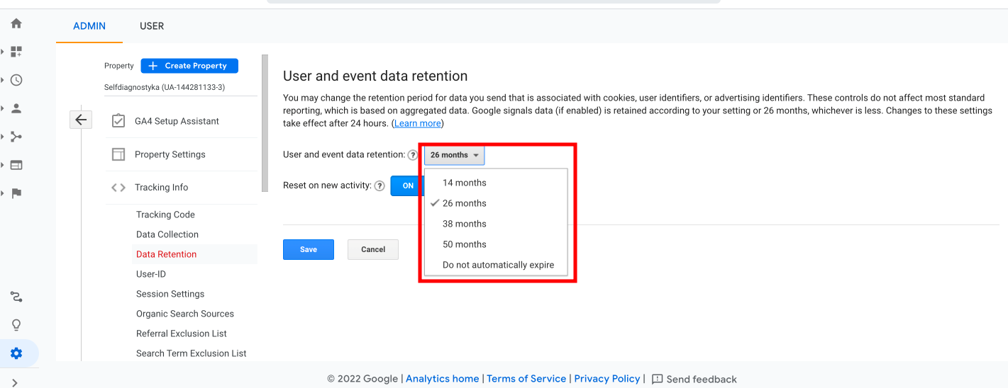 Każdy prawnik na swój sposób formułuje zapisy dotyczące przechowywania danych analitycznych. Jedni robią to w sposób bardzo ogólny, używając zapisu: „Ta strona korzysta z cookies Google Analytics”, a inni dokładnie opisują, do czego służą poszczególne cookiesy oraz jaką żywotność mają ciasteczka, z których korzysta strona. I to właśnie te zapisy będą nas interesować. Część narzędzi pozwala nam na zmianę długości okresu przechowywania cookiesów. Świetnym przykładem jest Universal Analytics, w którym ciasteczko użytkownika przechowywane jest przez 26 miesięcy. Warto dodać, że jesteśmy w stanie zmienić żywotność cookiesa tak, aby nigdy nie wygasał: