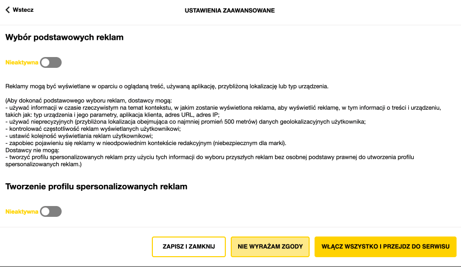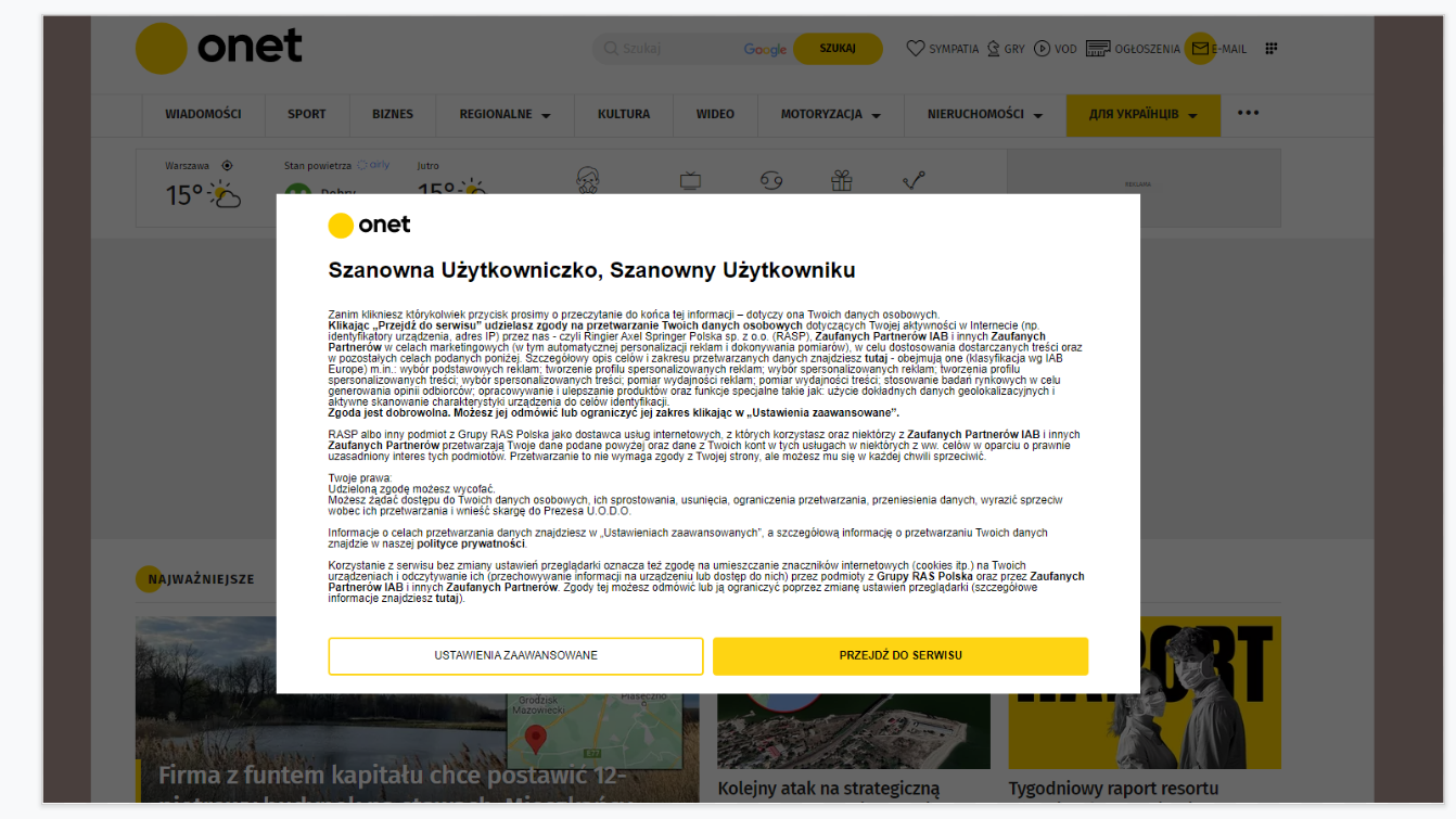 Poza możliwością akceptacji wszystkich cookiesów użytkownik powinien mieć możliwość bezpośredniego przejścia do zaawansowanych ustawień, gdzie sam zdecyduje, których zgód nam udzieli. Takie rozwiązanie zastosowano np. w serwisie Onet: