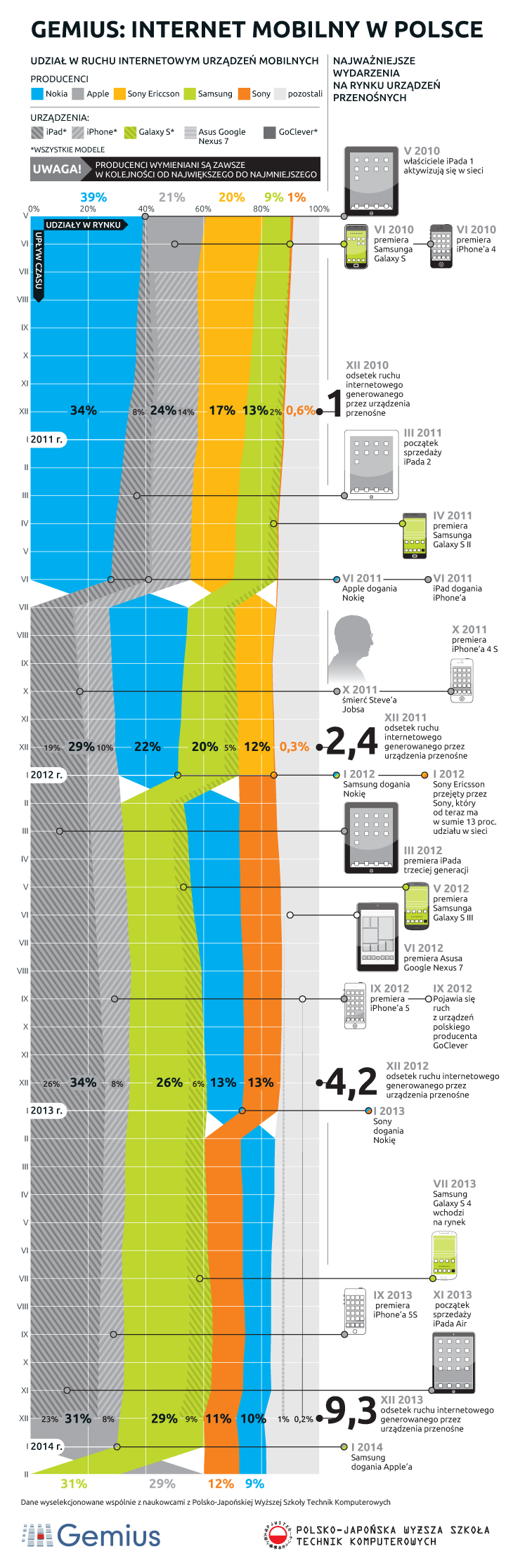 Ekspert z Polsko-Japońskiej Wyższej Szkoły Technik Komputerowych zwraca uwagę na trzy zjawiska, które wynikają z analizy danych pokazujących udział urządzeń mobilnych poszczególnych producentów w ruchu internetowym od połowy 2010 roku.