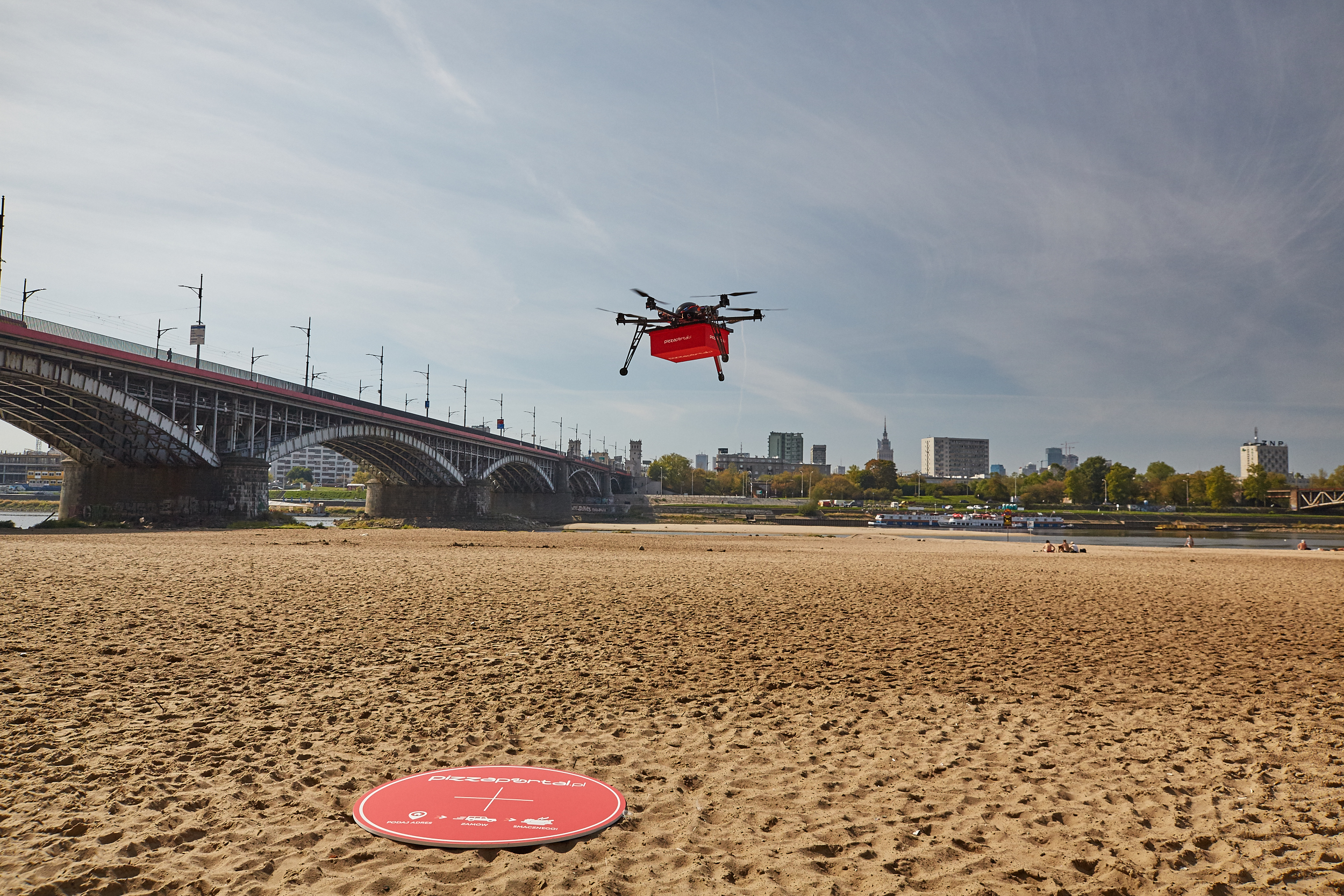 Dostarczenie jedzenia dronem miało miejsce w czwartek, 17 września, na praskiej plaży przy Moście Poniatowskiego. Bezzałogowy statek, sześciowirnikowiec o masie pięciu kilogramów, wystartował z okolic mostu średnicowego i wylądował tuż przy Moście Poniatowskiego przed lokalem Temat Rzeka. W specjalnie skonstruowanym pojemniku, podczepionym do drona, umieszczono kanapki oferowane przez jedną z warszawskich restauracji, które łącznie ważyły dwa kilogramy.