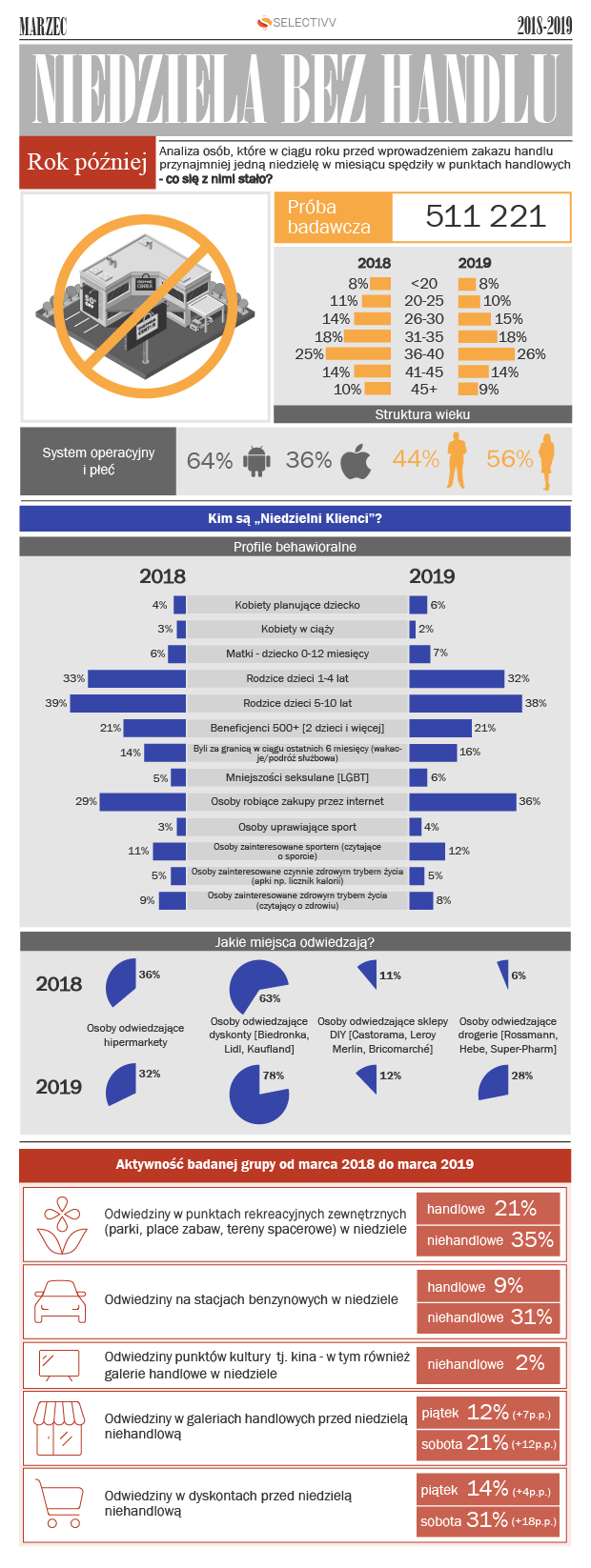 Powtórne badanie przeprowadzono na tej samej grupie – 511 221 użytkowników, którzy w ciągu 12 miesięcy poprzedzających wprowadzenie zakazu handlu, przynajmniej jedną niedzielę spędzili w punktach handlowych. Jak pokazują dane o lokalizacji pozyskiwane przez Selectivv, osoby te w dużej mierze stały się klientami takich sklepów jak: Biedronka, Lidl czy Kaufland.