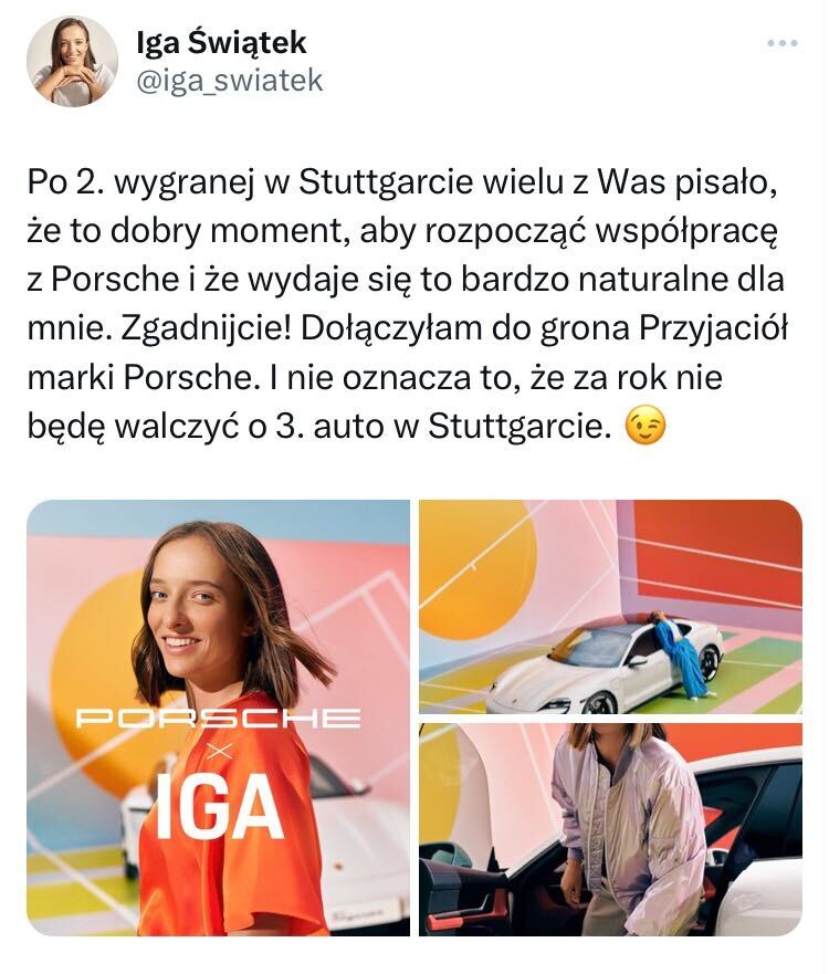 Porsche Polska i liderka światowego rankingu WTA ogłaszają początek kilkuletniej współpracy. To nie pierwszy kontakt tenisistki z Porsche; w 2022 i 2023 roku triumfowała w turnieju WTA 500 w Stuttgarcie, dwukrotnie zdobywając główną nagrodę – samochód tej marki.