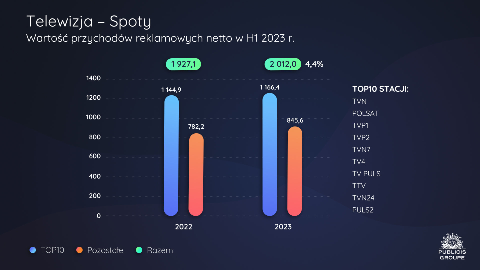Publicis Groupe publikuje wyniki Raportu o Rynku Reklamy dla pierwszego półrocza 2023 roku, dotyczące rynku telewizyjnego. W drugim kwartale 2023 r. rynek reklamy telewizyjnej kontynuował pozytywną tendecję z pierwszego, a dynamika inwestycji reklamowych jeszcze przyspieszyła – w okresie od kwietnia do czerwca rynek reklamy tv wzrósł o 4,3%, podczas gdy w pierwszym kwartale analitycy Publicis Groupe estymowali wzrost rynku na 4,0%. Tym samym w pierwszym półroczu 2023 r. rynek reklamy TV wzrósł o 4,1%.