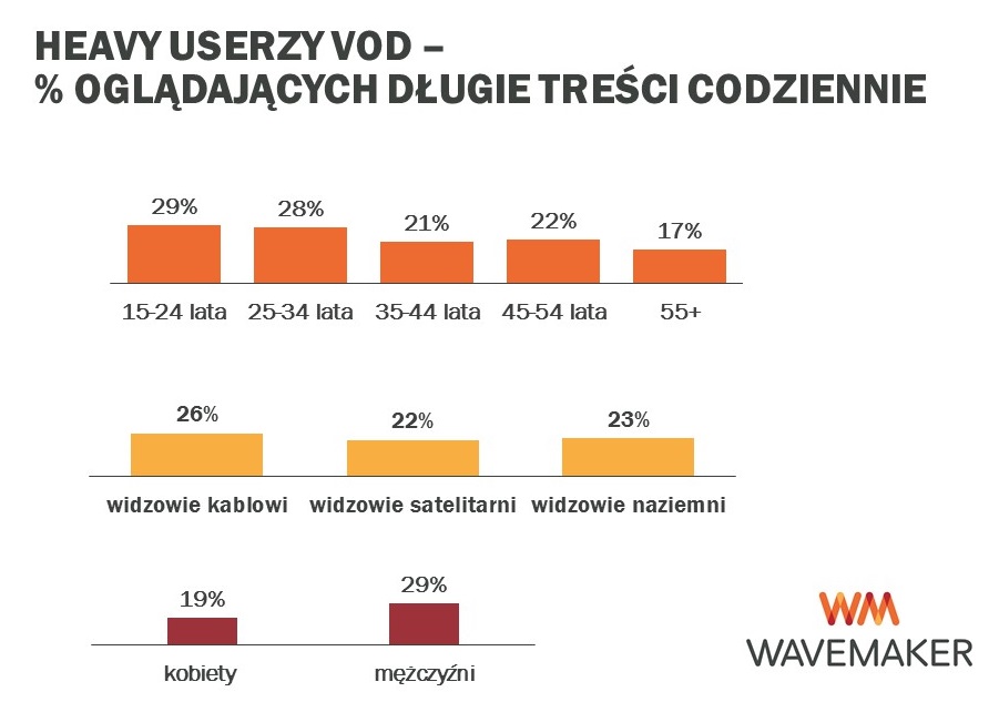 Najwięcej heavy-userów tradycyjnie spotykamy wśród młodej cyfrowej publiczności (16-34 lata), znacznie częściej wśród mężczyzn, a jeśli spojrzeć na częstotliwość e-oglądania wśród odbiorców różnych typów telewizji – najczęściej aktywnymi użytkownikami VOD są klienci kablówek.